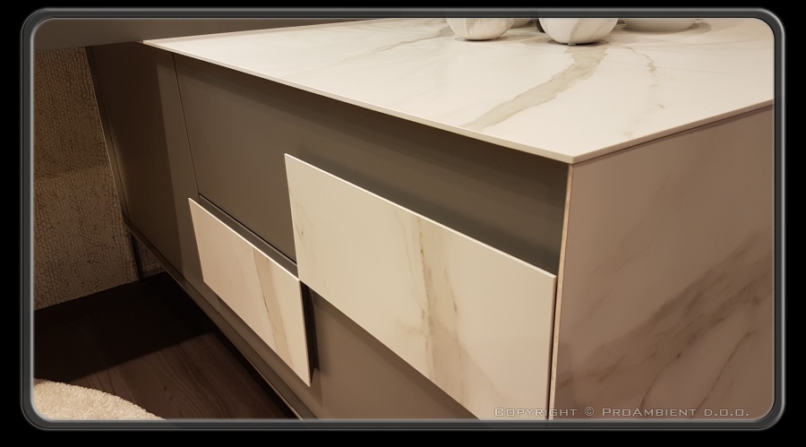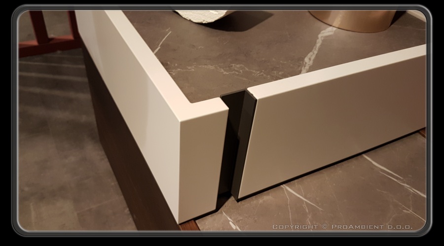 Elegantno oblikovano pohištvo, kjer veliko vlogo igrajo ročaji, vendar domiselno prikriti (skriti). Utori, ki se nahajajo na stranicah omaric ali veliki ročaji, ki zgledajo kot močan dekorativen element vratnih ličnic. Barvna skala je omejena na imitaciji kamnitih tekstur, kjer pa je zaslediti tudi veliko steklenih in keramičnih polnil. Bela barva se počasi umika temnejšim - črnim in sivim odtenkom. Le-te je zaslediti tako na pohištvu, kot tudi na gospodinjskih aparatih. Kot minimalen kontrast umirjeni barvni skali ostaja zlata, ki poudarja eleganten in prefinjen izgled.